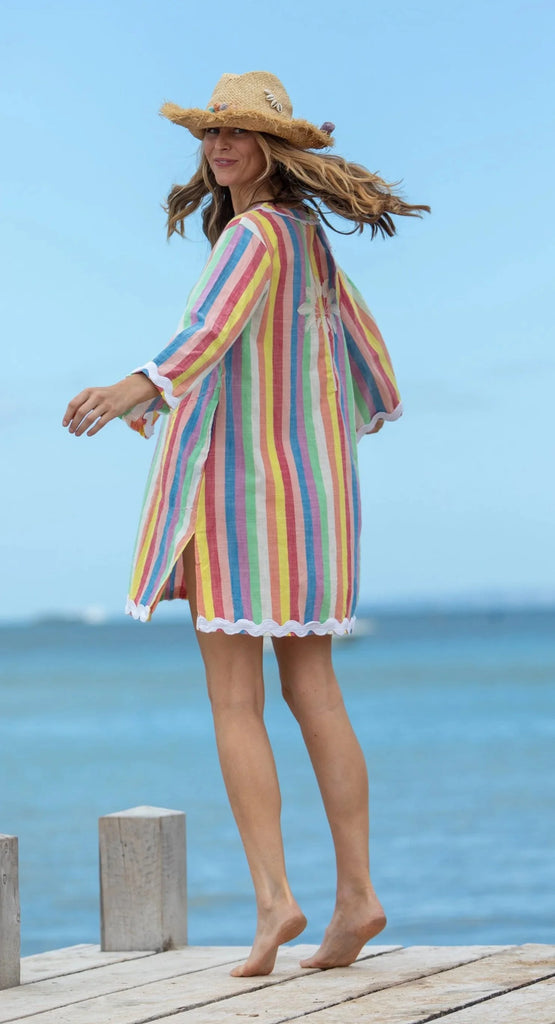 The striking stripe design is elevated with a playful ric rac trim and intricate embroidered detailing adding artisanal charm to its breezy silhouette.