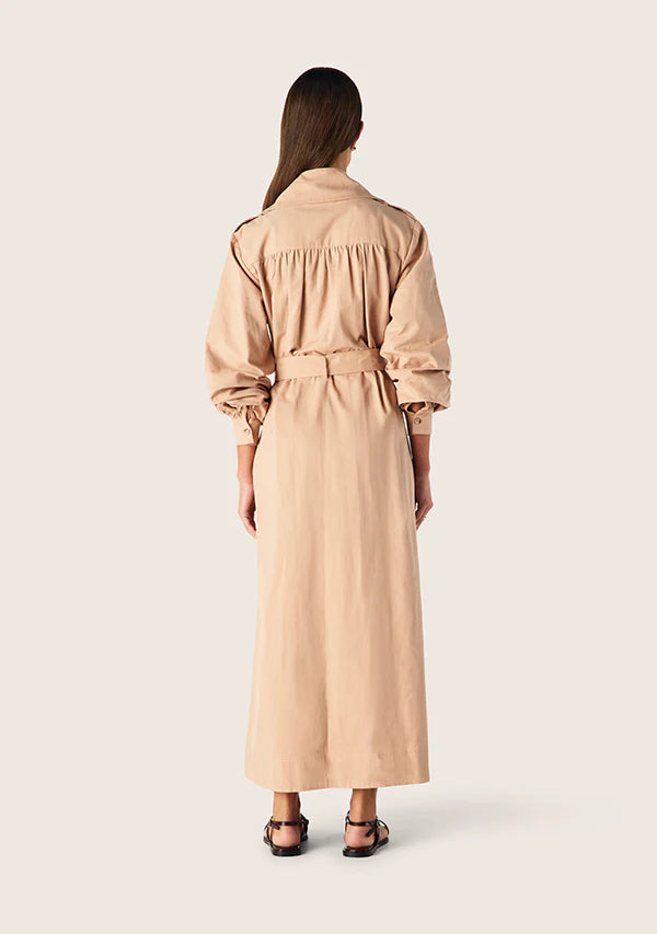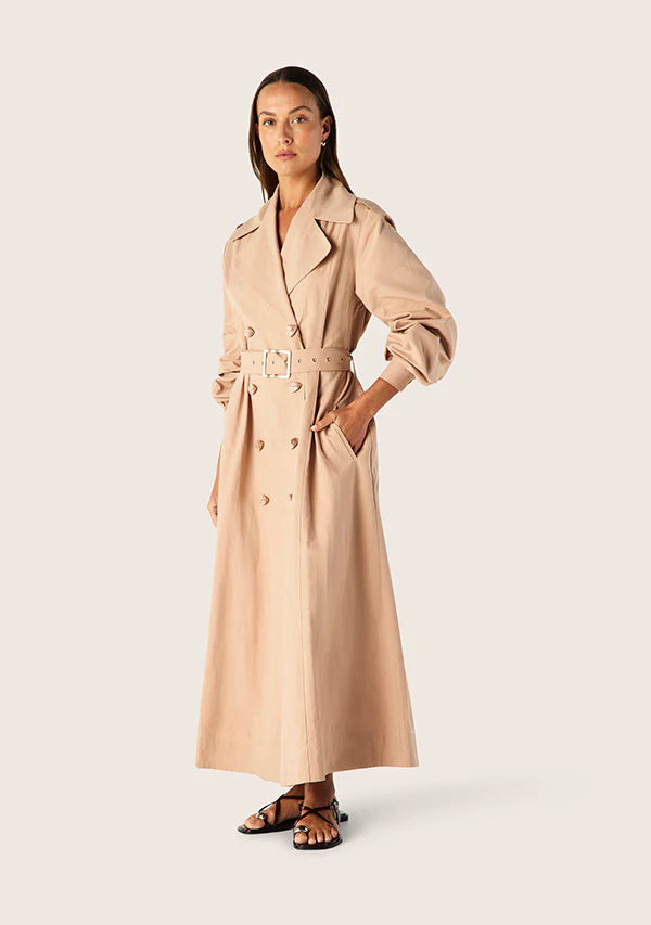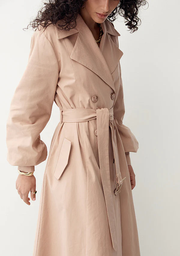 The definition of a transeasonal staple, the Arena Trench Coat is a piece that will stay in your wardrobe for years to come. Crafted from a mid-weight cotton-blend canvas in light pink, it fits with wide peaked lapels, balloon sleeves and an elegant A-line silhouette that falls to a maxi length. Double-breasted tonal shell buttons punctuate the body, while a buckled belt can be used to cinch the waist.