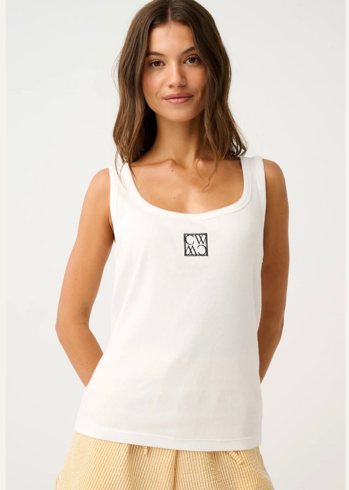 - CW signature monogram embroidered in black on the chest