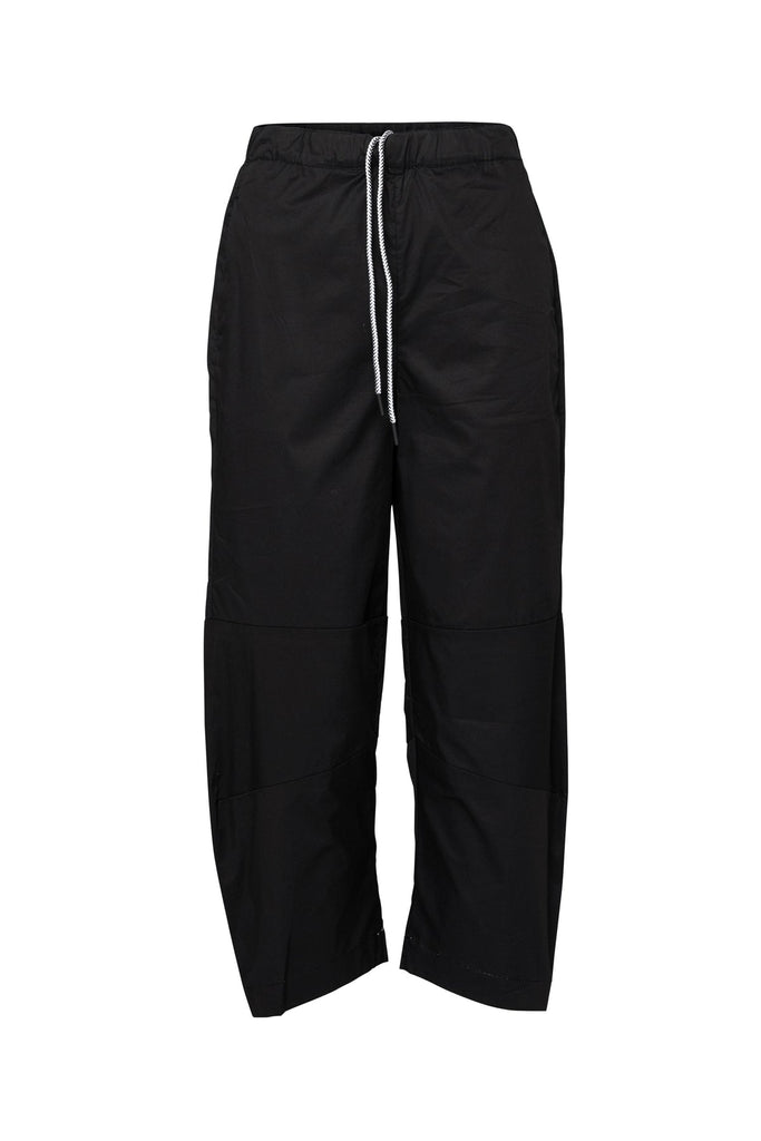 - Flat waisted front with elasticized back with contrast cord drawstring